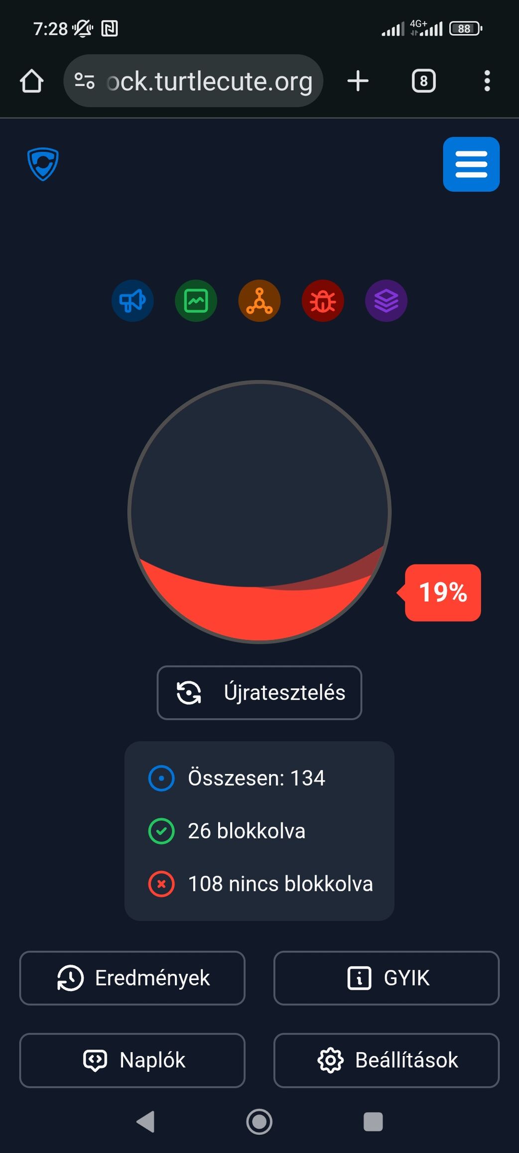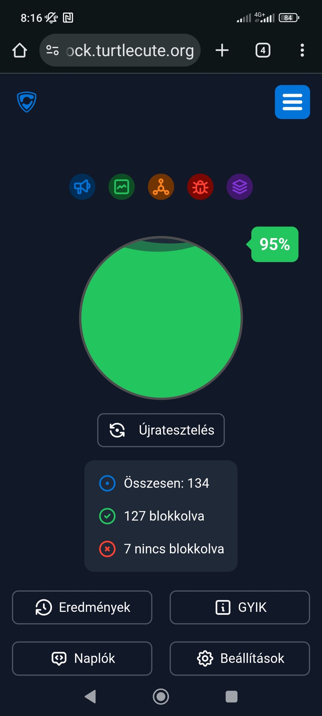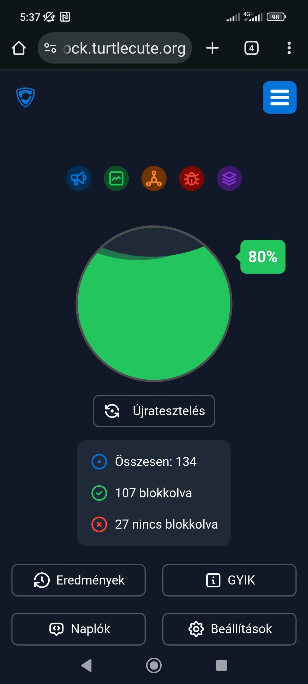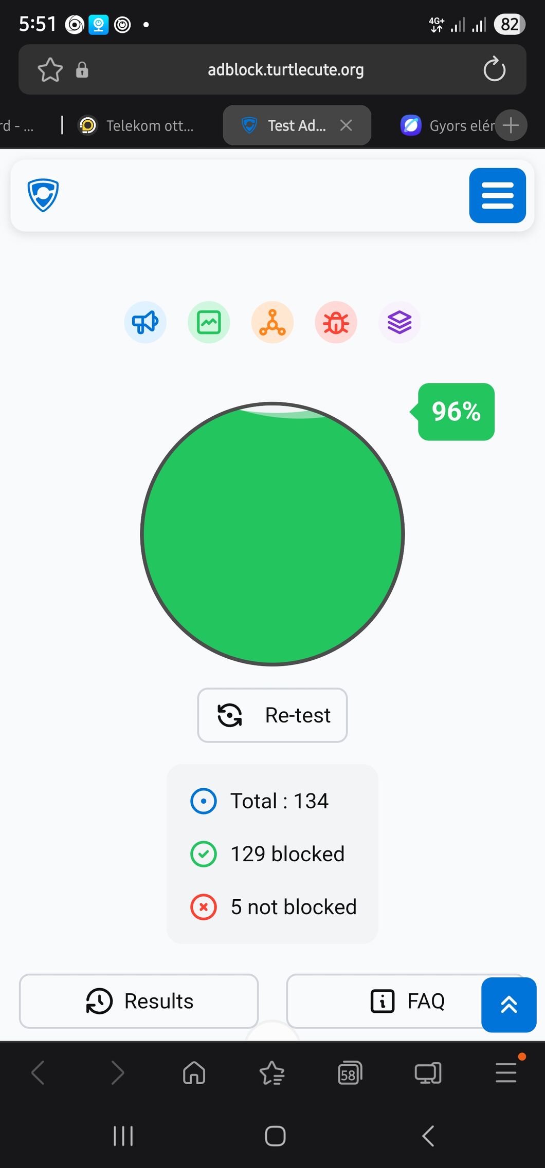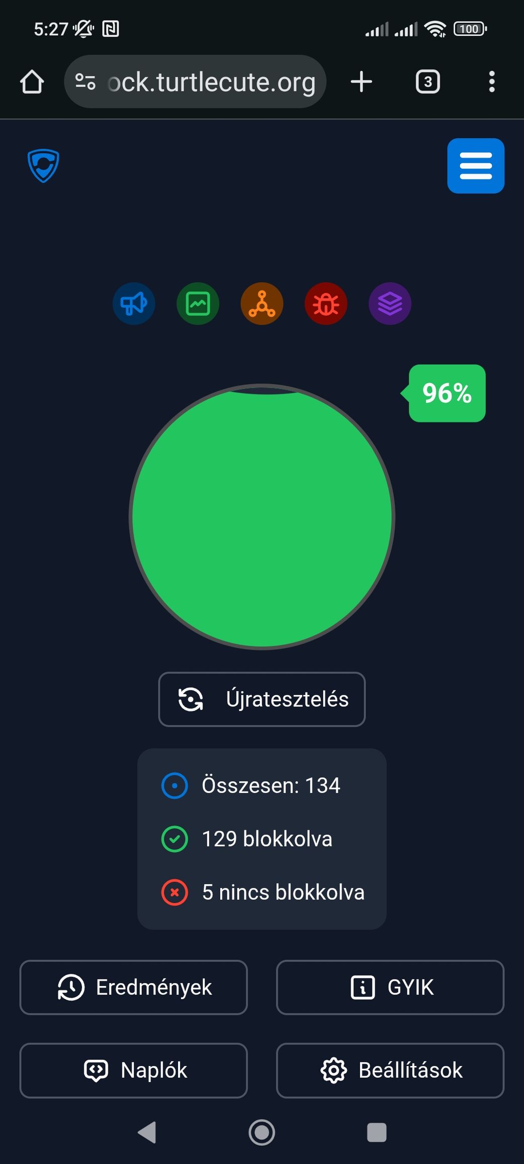 Nekem se volt eddig 96 %, csak a két böngésző kiegészítővel együtt. Erre most teszek egy próbát, kikapcsoltam a két kiegeszítőt, és a 76.76.2.2 hozott magában 95 %-ot 127 blokkolt elemmel. Wow, nem is olyan rossz.
