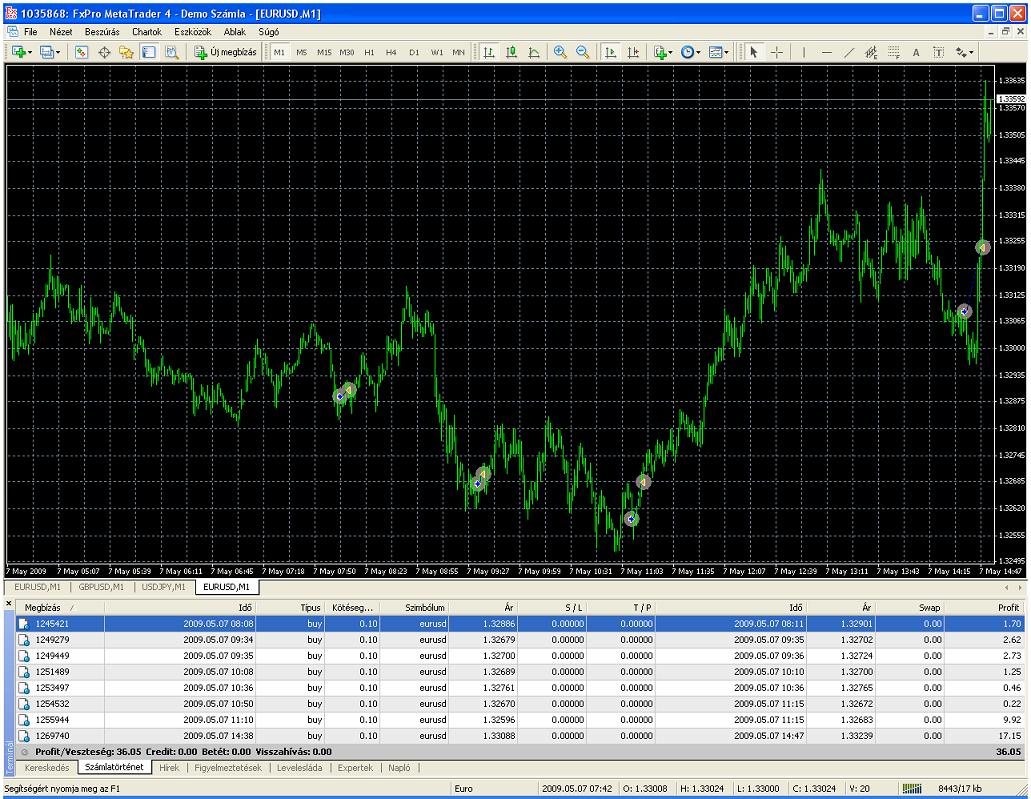 Nem szoktam hosszabb távra tervezgetni, minden nap tiszta lappal indul. 1-5-15 perces chartot figyelem, és elemzem (fibo szintek, 5-15 perces trendvonalak törése vagy az azokról történő elrugaszkodás, stb. Csak az 5 perces idősík mozgásának irányában kötök a perces charton, ellentétesen soha. Ha 5 percesen fordulás kezd kialakulni kivárok, míg el nem dől az új irány. Ellaposodó, oldalazó mozgásban nem kötök, szűkülésbe szintén nem kötök, ilyenkor megvárom a kitörést. Nálam EURUSD-n 0,8-2 közti a spread főműsoridőben, ezt bőven ki lehet gazdálkodni.