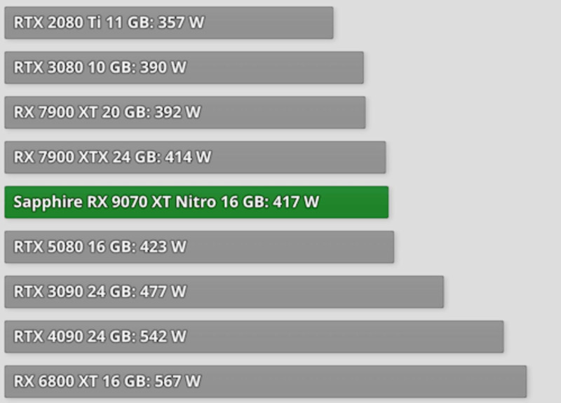 A kép a különböző grafikus kártyák játék közbeni áramfogyasztását hasonlítja össze. A TechPowerUp által készített diagram a Wattban (W) mért fogyasztási adatokat mutatja be, a legalacsonyabbtól a legmagasabb értékig sorba rendezve.