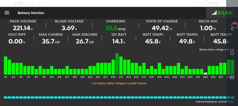 Mire megcsináltam a képernyőmentést, addigra a 8 cellás kijelzőn kigyulladt az 5. cella is, jelezve, hogy az is fel van töltve, a 12 V-os akkun pedig 14.1 Volt lett (töltés közben) a feszültség.Valóban alacsony a feszültség a nagyfesz akkuban, vagy csak valami fantom hibaüzenet jött a hideg miatt? (45 Fahrenheit fok az ugye ~8 fok Celsiusban)