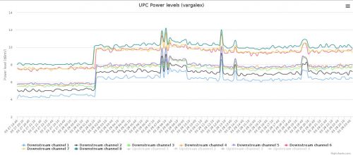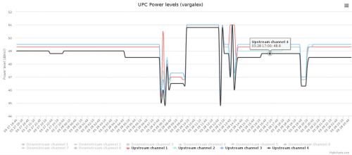 Természetesen minden érték látszik egyben, de hogy jobban látható legyen a változás külön képet csináltam csak a downstream, illetve csak az upstream channel-eket kiválasztva.