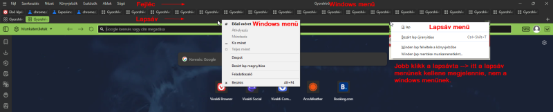 A fejlécre kattintva egy ilyen windowsos menü nyílik, de a lapsávon már nem annak kellene lennie. A lapokra kattintva jobb klikkes menő (tabmenü) az működik, az egy hosszú lista, az más. Az üres tabfelületen kellene a lapsávmenőnek előjönnie.