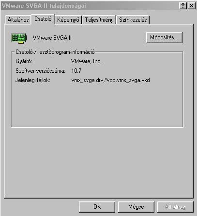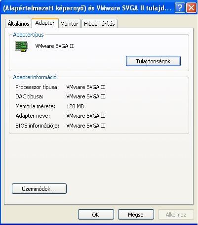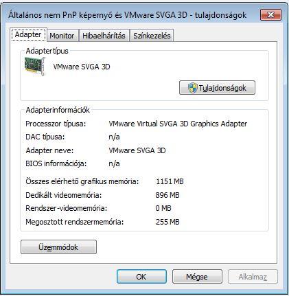 Igen, én is be tudok állítani akár fullHD felbontást is (a videóadapter is svga lett), ergo "fű alatt" ad a VMware a virtualizált gépnek videómemóriát, de olyan program, aminek kellene minimum 4MB vram (pl játék), az rinyál, hogy nincs elég. Videóadapter beállításoknál látom is, hogy 64KB van...