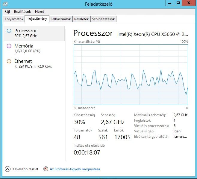 Egyik üresjáratban megy, másikon meg telepíteném egy vCentert, de nemhogy a telepítés nem halad, de az egész használhatatlan. A kurzor is szaggat, jobb egérre mire feljön a popup befonom a szemöldökömet RDP-n... Ez wtf? Meg ezt a cpu usaget se értem, ez is mi?Mindkét szervernek 10-10GB RAM-ot és 1x6 Core Cpu-t állítottam be. Maga a host egy ProLiant 380G7, 2x6 Core fizikai maggal és 24GB RAM-mal.