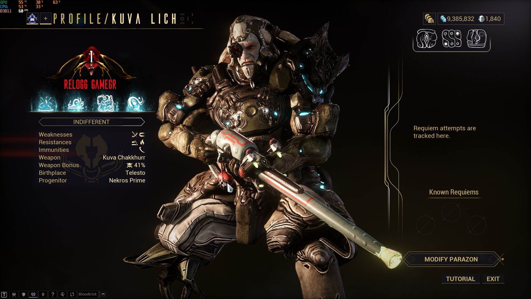 Saryn, Volt nekem mindkettő Lua lencsés, ami kell éppen iskola azt viszem. Különben is örüljenek ott ha carry van egy Volt vagy Saryn végett.Más: Meglett életem első Lich-je. Hát nehezebbre számítottam, Wukong-gal egyszerű volt levadászni és nem is kellett sokszor próbálni a mod-okat. Egyet eltaláltam a másik 2 meg kijött Murmur-ból. Jó kis grind, de nem tűnt hosszúnak. Be is szereztem a 2. Lich-et, másik fegyver, de nincs Ephemera. Vicces a neve. De az az 5 Forma a fegyverekbe... Vicc ahogy írtátok.