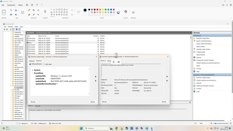 Most kellene akkor belenézni a CBS.log-ba, illetve a Windows eseménynaplóba (Alkalmazás- és Szolgáltatásnaplók/Microsoft/Windows/WindowsUpdateClient/Operational), és ott rászűrni a Kritikusra, illetve a Hibákra.