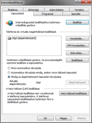 A Csak en akkor jo ha csak egy felhasznalo van, ha van tobb felhasznalo akkor termeszetesen Barki.... Amikor kesz a PPPoE kapcsolat vagyis beallitod es mar tudsz tarcsazni. akkor lepjel be az IE / Beallitasok / Kapcsolatok fulre es allitsd be igy.