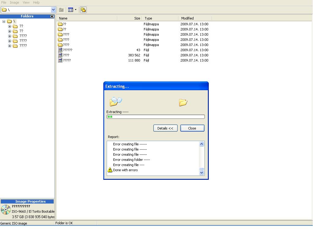 Letöltöttem az undiskert, majd betallóztam az iso-t. Itt kérdőjelekkel jelölte az összes fájlt. Aztán Image->Extract to-> Kiválasztottam a G meghajtót és ez fogadott:Rányomtam a 'yes to all'-ra, és ezt írta ki (ha a 'no to all'-ra nyomtam akkor is):