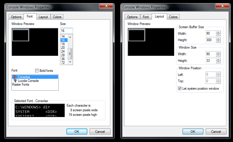 az ablakot szintén ezért nem tudod átméretezni, mert ezek fix felbontások. a betűméretet állítva viszont nagyobbá varázsolhatod a dolgot. nekem pl. a gyári cmd beállítás túl kicsi, ezért én át is szoktam állítani ilyenre.
