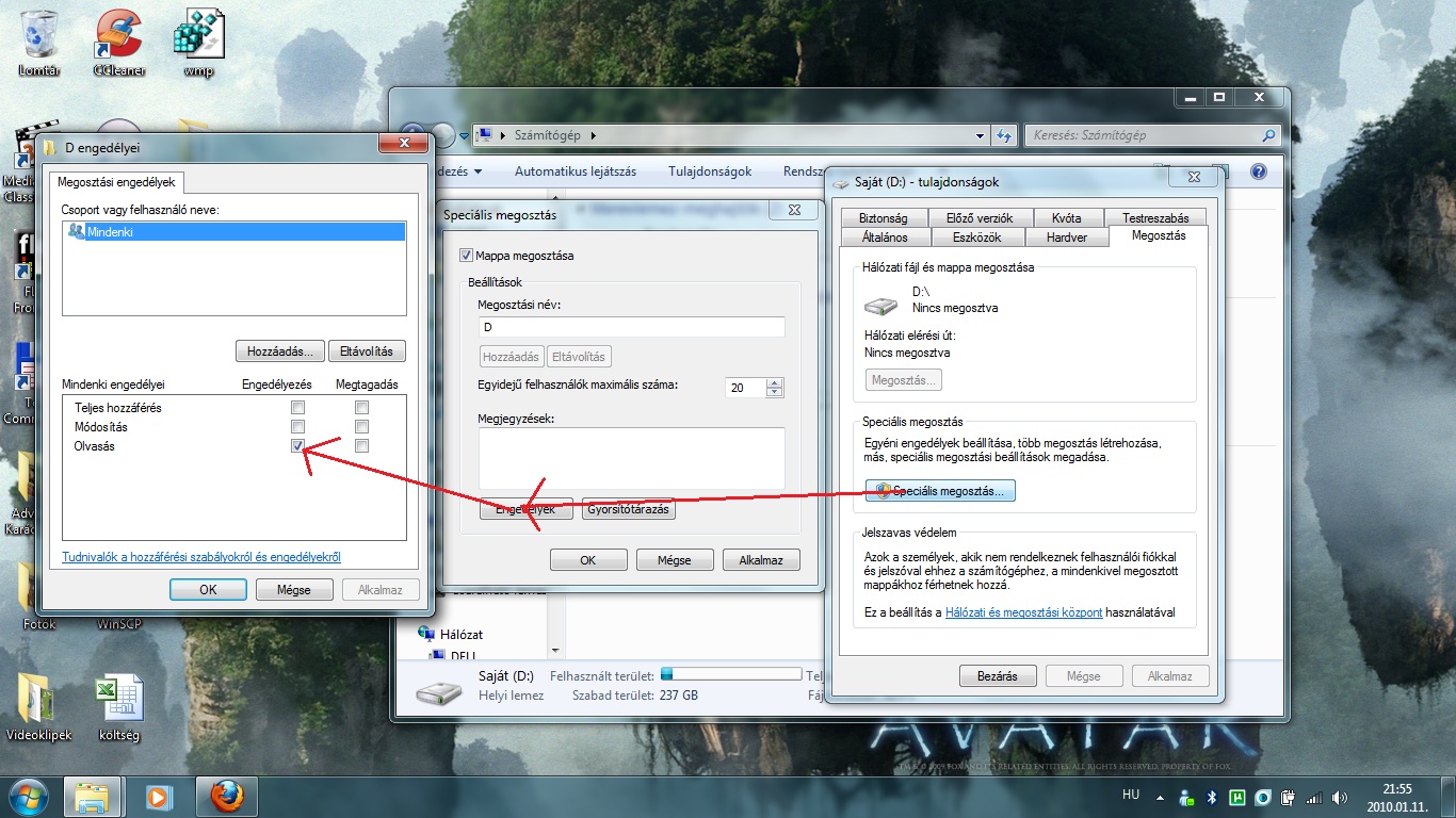 WonderCsabo: tőled is csak ennyit szeretnék tudni, hogy merre tudom ezeket a beállításokat megadni, mert ha win7 alól az egész partíciót megosztom akkor az xp-s gépen csak egy hibaüzenetet kapok, hogy nincs jogom a hozzáféréshez