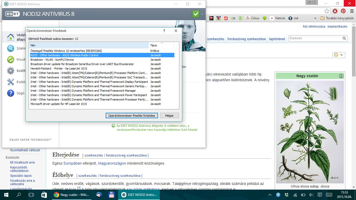 Több gépen is használom már a Win10-et, mindegyiken NOD32-vel. A víruskereső rendszeresen figyelmeztet, hogy operációs-rendszer frissítések érhetőek el.De a frissítések között a windows frissítéseken kívül nem jelenik meg a többi. Valamit le tudok frissíteni az eszközkezelőből manuálisan, de van amit nem, mert nem találom!