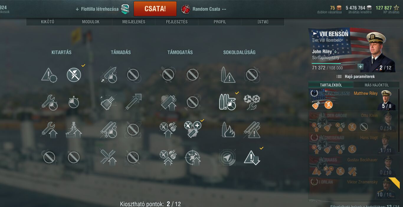 Német ágon Bismarckot húzom épen. Gnei-t nem léptem át, jó volt tapasztalat szerzésnek. Gnei jobban ég, mint a Bismarck. Kapitány skillben nem az ajánlottat választottam mindegyiket, kicsit saját stílusomra szabtam, így már számomra használhatóak.