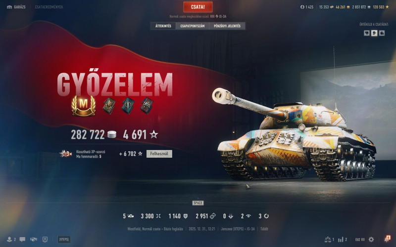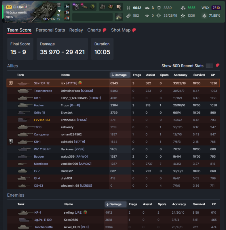 Nekem nem az fáj hogy nem nyerek eleget, a győzelmi arányom nagyjából 49.10-49.20 között mozog, ennél jobb nem lesz, ha megfeszülök sem. Teljesen telibe szarom a győzelmet, sőt néha TD-vel jobb veszteni, mert van hogy akkor többet lehet sebezni. Csak valami használható teljesitményt szeretnék nyújtani, mielőtt ledarálnak minket 2 perc alatt, vagy forditva, ha lassabb tankkal vagyok, 2 perc alatt max vánszorogni tudok a csapatom után, akik ledarálják a medekkel és lightokkal az ellenfelet. Ez igy teljesen értelmetlen. Legalább egy olyan határt kéne megvonni, hogy mondjuk 4000 vagy 5000 WTR alatt és fölöttiek ne találkozhassanak, valami alsóház vs felsőház jellegü dolog, nem azt mondom hogy pont ugyanolyan játékosok kellenek tudásban. De ne legyen már az hogy 0 csatás szerencsétlenből 10 bemegy egy nyolcas vagy tizes csatába (mert a WG gondoskodott róla, hogy most már literally 0 csatával is lehessen top csatákban bohóckodni), és 1 percen belül mind halottak, mindenkinek elbasszák a játékélményét, nekik se jó ez és senkinek se.