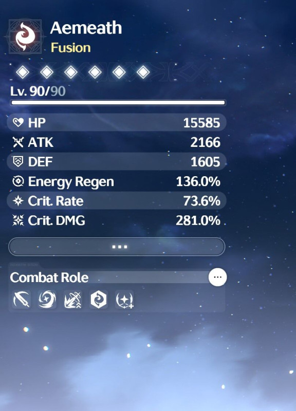 Nálam kicsit több energy regen van mert ugye Emerald of Genesist használok tehát az megspórol nekem 1 energy rollt az Echon. 'Lehet ki sem szedem a signature fegyvert, ez sem sokkal gyengébb és így kényelmesebb is használni talán'Crit % kicsit több is van mint kéne mert én ugye Shorekeeper+Lynae-vel használom mert Mornye-t skippelnem kellett.