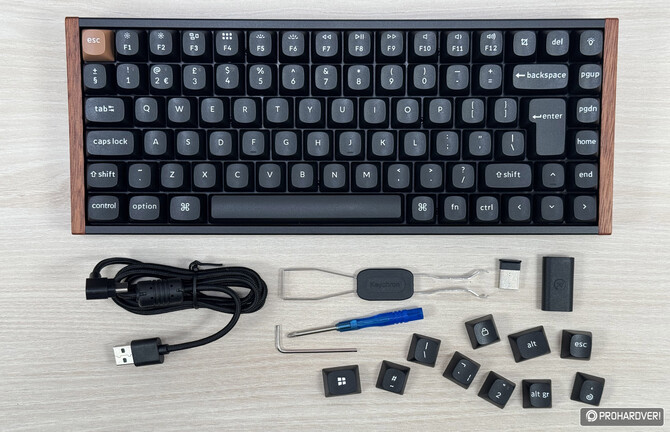 A csomagolás a gyártótól megszokott minőségű, a tartozékok között egy 120 centiméter hosszú, kicsit merev, de jó minőségű, fekete színű USB Type-A/Type-C szövetkábelt, egy kupakkiszedőt, egy csavarhúzót és egy imbuszkulcsot, egy USB-A csatlakozós rádiós adóvevőt, egy USB toldót, valamint extra billentyűsapkákat találunk, ez utóbbiaknak köszönhetően az eszköz Windows és macOS operációs rendszerekkel történő használatra is tökéletesen alkalmas.