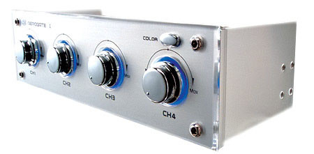 Ezerszáz forint nem túl sok pénz egy ventilátor-szabályozóért. Egy nagyobb házban gyakran dolgozik négy ventilátor, melyek szabályozóit már nem túl egyszerű elegánsan elhelyezni. A Cooler Master Aerogate egy csapásra megoldja a problémákat. A 4400 forintos vételárért négy krómozott szabályzót kapunk egy ötnegyedes előlapra erősítve. A tekerőgombok köré három színben világító gyűrűt szereltek. A szabályozó öt és tizenkét volt közötti feszültséget tud átadni.