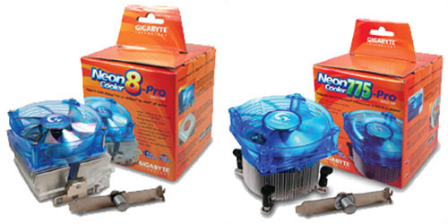 A Neon Cooler 8 mellőzi a divatos hőcsöveket, mégis Athlon 64 4000+ és FX 55-höz is ajánlja a gyártó. A hőleadásról hatalmas (95 x 97 x 68 mm) rézmagos borda gondoskodik, melyen egy 94 x 94 x 25 mm-es légkavaró trónol. A Neon Cooler 8 Pro esetében a lapátos percenkénti fordulatszámát 1700 és 3500 között lehet változtatni, a sima Neon Cooler 8-hoz nem jár szabályzó. A leglassabb állásban a gyártó szerint 19 dBA zajszintet, a leggyorsabban közel 65 cfm-es levegőszállítást produkál a 450 grammos hűtő. Kérdés, hogy a halk üzemhez mekkora légszállítás, a maximális fordulatszámhoz pedig mekkora hangerő párosul. A szabályzós Pro változat ára baráti, 4100 Ft, a sima verzió 3600 Ft.