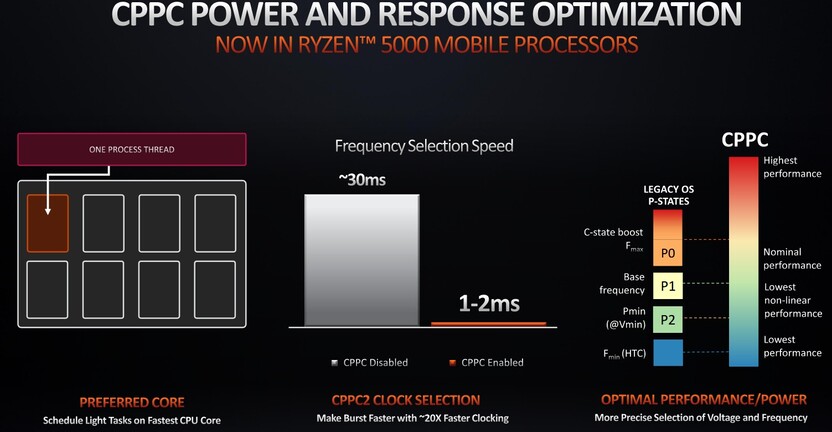 A technikai háttér tekintetében két újításra érdemes koncentrálni. Egyrészt a korábbi memóriavezérlő kiegészült egy rendkívül alacsony energiafelhasználást biztosító állapottal, másrészt bevetésre került a CPPC2 vagyis a Collaborative Processor Performance Control. Utóbbi igazából nem újdonság, ha az asztali Ryzenekre tekintünk, de mobil szinten az, mivel alacsony fogyasztási keretek mellett kifejezetten nehéz alkalmazni ezt a technikákat. A lényeg itt a nagyon precíz feszültség- és órajelskálázás, miközben az órajelváltás akár hússzor gyorsabban is megvalósulhat, ráadásul az új generáció esetén nem kell szinkronban lennie az IGP, illetve a processzormagok feszültségének. A magok konkrétan egyedi finomszemcsés energiamenedzsmentet használnak.
