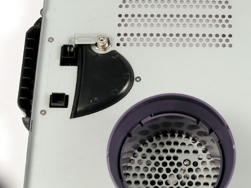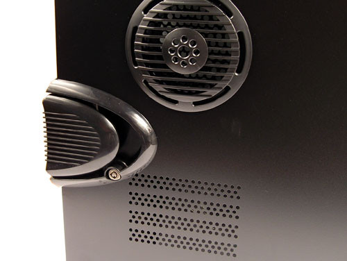 Az oldallapot megfordítva látható az egyszerű zárszerkezet, mely a műanyag nyitó kis fogait blokkolja le; valószínűleg egy erélyesebb rántással eltörhető. A kör alakú lélegeztető alatt egy cső rejtőzik, mely egyenesen a processzorhoz juttatja a friss levegőt.