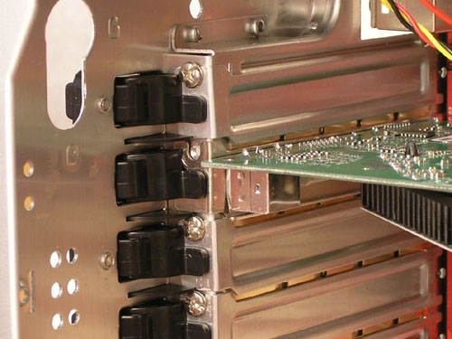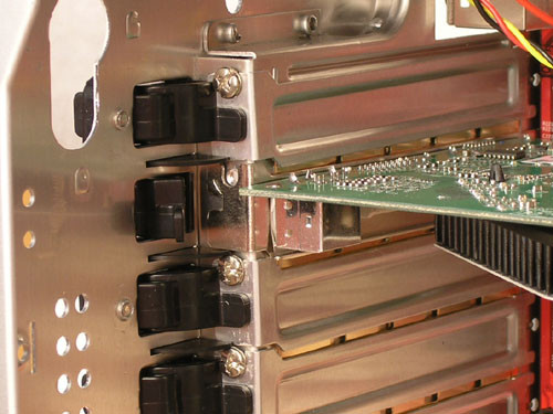 Sajnos a hét bővítőkártyahely közül csak a felső négy fölé jutott csavarmentes rögzítő. Ez nagy hiba, mert a többség szereti jó minőségű hangkártyáját a többi melegedő és elektronikus zavarokat keltő alkatrésztől jó távolra, a ház aljába tenni.