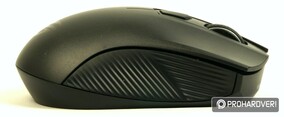 A ketyere alapból egy 1000 hertzes USB frissítési rátát is támogató, 2,4 GHz-es rádiójellel kommunikál a számítógéppel, és az ehhez kellő, mini USB-s egység a mágnesesen rögzülő felső bukolat alatt, a szerkezet bendőjében figyel. Az RF kapcsolat SmartHop technikát használ, ami annyit tesz, hogy az apparátus folyamatosan figyeli a 2,4 GHz-es sávot, és ha adattorlódást vagy interferenciát észlel, automatikusan (és azonnal) a leginkább szabad csatornára hangolja át magát. Ha ez nem volna elég, Bluetooth-os módban is használhatjuk a drágát, csak a hasi odalán figyelő, háromállású (RF/BT/off) pöcköt kell a megfelelő pozícióba (középre) húznunk – értelemszerűen ilyenkor nem kell a kis adóvevő. RF módban reszponzívabb a ROG üdvöske, cserébe viszont gyorsabban merülnek a telepek. Az ASUS által megadott adatok körülbelül 300, illetve 433 órás üzemidőt ígérnek. Mivel sajnálatos módon nem állt rendelkezésünkre ez az időintervallum, sem megerősíteni, sem cáfolni nem tudjuk az állítást, de azt mi is észleltük a driverben prezentált töltöttségi szintet monitorozva, hogy "kékfoggal" valóban tovább kitart az egér.
