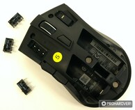A két mágnessel helyén tartott borítás felső részét könnyedén leemelve (a hátul lévő bemélyedésbe pont befér a körmünk) megpillantjuk a belső tér felső szintjét. Itt tudjuk kicserélni az elemeket, szállításhoz elraktározni az USB-s vevőegységet, továbbá hozzáférhetünk a nagyon minimális (lényegében nulla) holtjátékkal rendelkező bal- és jobb gomb alatti mikrokapcsolókhoz is, amik a grátiszba adott példányok mintájára szintén abszolút minőségi, picit mélyebb hangú, taktilis japán Omron D2F-01F-ek(!). Ez igen!