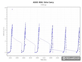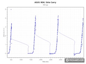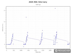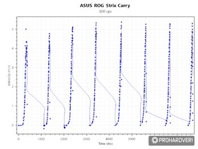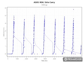 Ahogy az látható, a ROG Strix Carry szépen teljesített, felbontástól függetlenül 4-5 m/s közti értékeket produkált, zömében 4,5 m/s közvetlen szomszédságában, így elmondható, hogy a játékosok 99,9%-ának bizonyosan meg fog felelni a perfect control, mert a legalacsonyabb egérérzékenységgel játszó emberek is csak viszonylag ritkán tesznek ilyen kaliberű mozdulatokat. Kékfoggal egy fokkal visszafogottabb volt a performansz, de még itt sem lehet igazán okunk panaszra, a 4 m/s még így is megvolt, mint a legalja, ellenben a fellépő, plusz input lag miatt a gamerek inkább a rádiós üzemet fogják favorizálni.