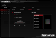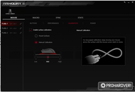A "Calibration" oldalra kattintva az egér alatt terpeszkedő felülethez kalibrálhatjuk az érzékelőt. Vannak előre eltárolt, konkrét alátétekhez szabott profilok, ezenfelül anyaguk alapján (úgy mint szövet, műanyag és üveg) megkülönböztetett típusok, és a LoD-ot is három fokozatban definiálhatjuk (alacsony, közepes, magas). Manuális kalibrációkor addig kell a padon mozgatni az egeret, amíg a kurzor meg nem moccan. A "Mouse" részleg utolsó szegmense a "Power" fül, ahol megmondhatjuk a rágcsálónak, hogy hány perc zavartalan létezés után menjen alvó módba – vagy hogy menjen-e egyáltalán. A jobb oldalon az elemek/telepek töltöttsége látható. Mikor vészesen alacsonnyá válik az energiaszint, az on-the-fly cpi váltó alján héderelő LED a piros színt hadrendbe állítva vad pislákolásba kezd.