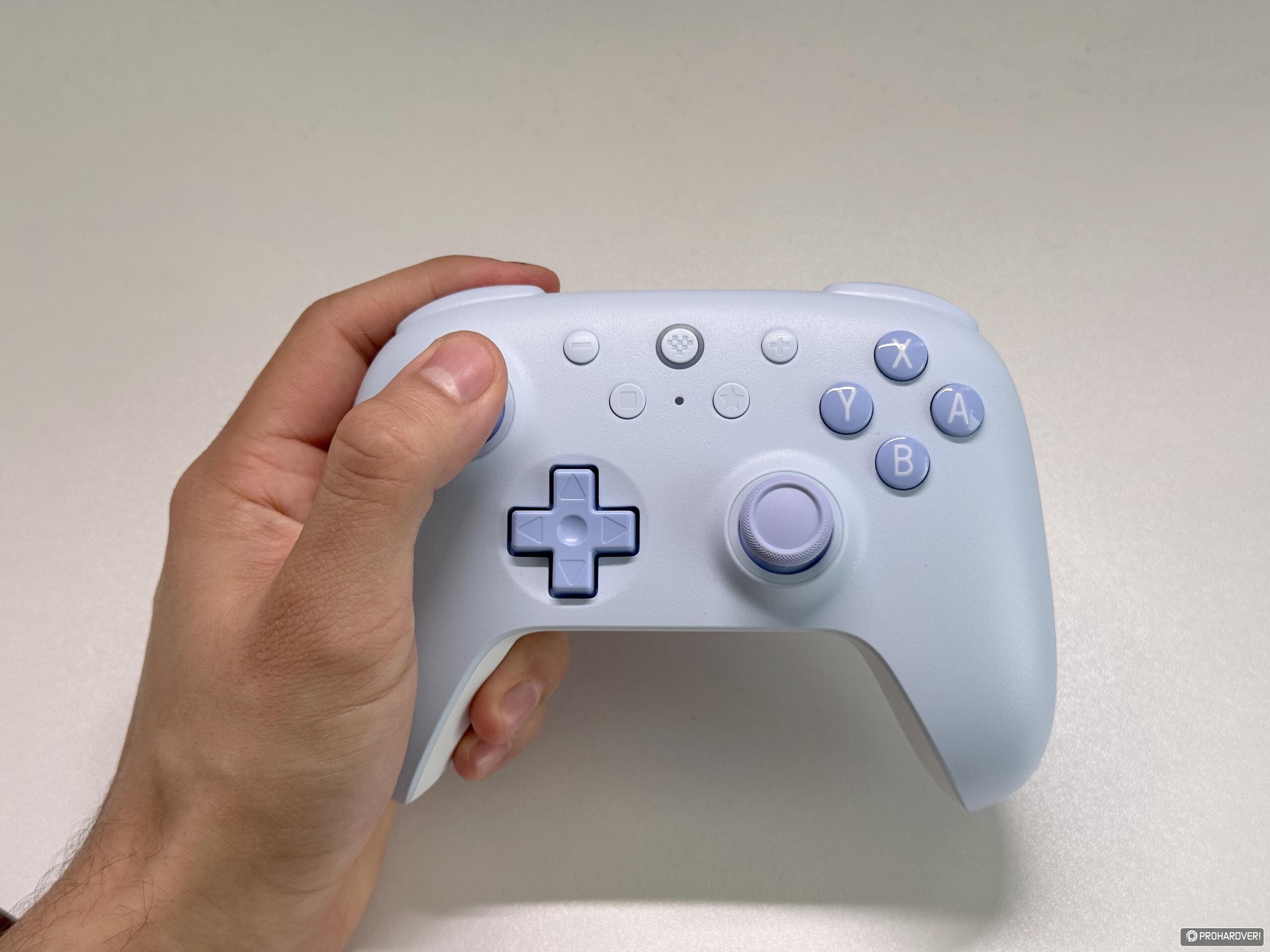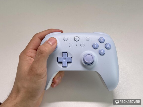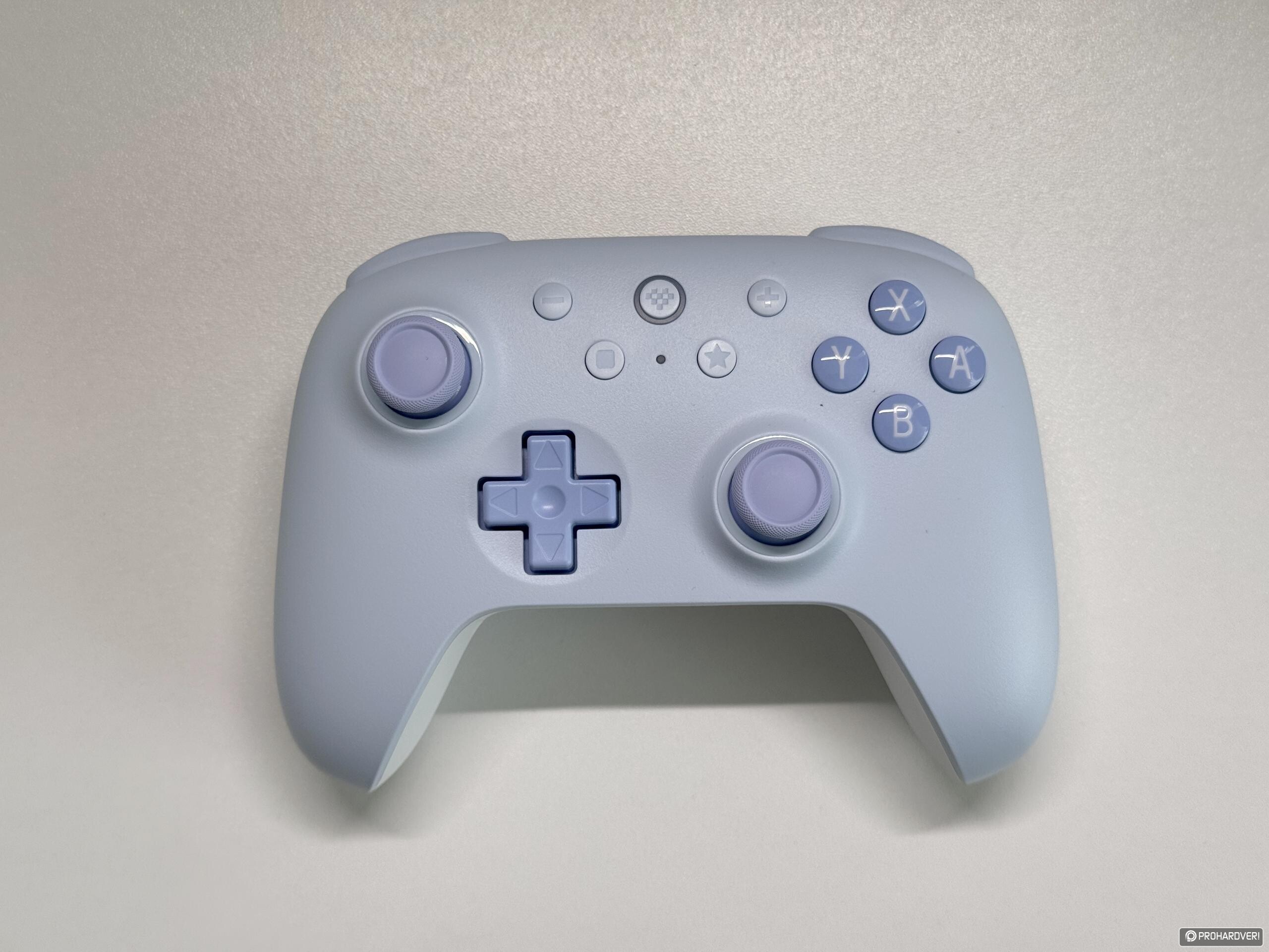 A kontroller formavilága ismerős lehet, ergonomiája leginkább a Switch Pro Controller vonalát idézi. A lekerekített markolatok kézre állnak, a gombkiosztás jól átlátható, a mindössze 217,5 grammos tömeg pedig kellemesen könnyűvé teszi a használatot anélkül, hogy az eszköz olcsó hatást keltene. Hasonlóan pozitív benyomást kelt a burkolat kialakítása is: hátul az enyhén bordázott felület segíti a biztosabb fogást, elöl pedig egy simább, kellemes tapintású borítás fogad. A felső ravaszok és bumperek mellett oldalanként egy-egy extra programozható gomb is helyet kapott, amelyek ugyan kényelmesen elérhetők, de talán még természetesebb megoldás lett volna, ha a megszokott hátsó részen kapnak helyet. A PC-s verzió hátlapján emellett egy külön kapcsoló is található, amellyel az adapteres és a Bluetooth mód között válthatunk. A csomag tartalma egyébként meglehetősen puritán: a kontroller mellett a PC-s kiadáshoz egy 2,4 GHz-es adapter, mindkét változathoz pedig egy-egy egy méteres töltőkábel jár. Dicséretes részlet, hogy a mellékelt kiegészítők színben illeszkednek az adott kontrollerhez, ugyanakkor sem a kábelek hossza, sem azok minősége nem nevezhető különösebben kiemelkedőnek. Hordozótok vagy egyéb extra kiegészítő nem jár a csomaghoz, bár ezt ebben az árkategóriában aligha lehet komoly hiányosságként felróni.