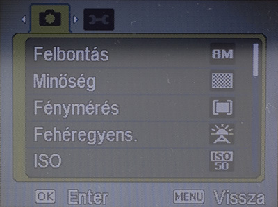 Az első almenüben a fényképezőgép képalkotásért felelős paramétereit szabhatjuk saját igényeink szerint: beállíthatjuk a felbontást, a JPEG tömörítését (minőség), a fénymérés módját, a fehéregyensúlyt, az érzékenységet (ISO) és más hasonlókat.