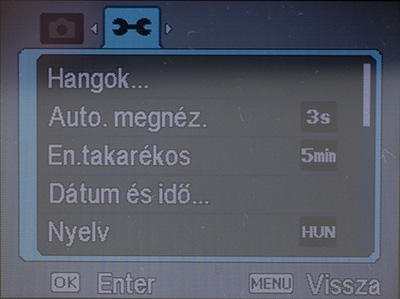 A második fülecske alá kerültek a készülék egyéb paraméterei, mint például a hangok, a fotózás utáni automatikus képmegjelenítés, az energiatakarékos kikapcsolás időzítője, a dátum, az óra, a menü nyelvezete, stb.
