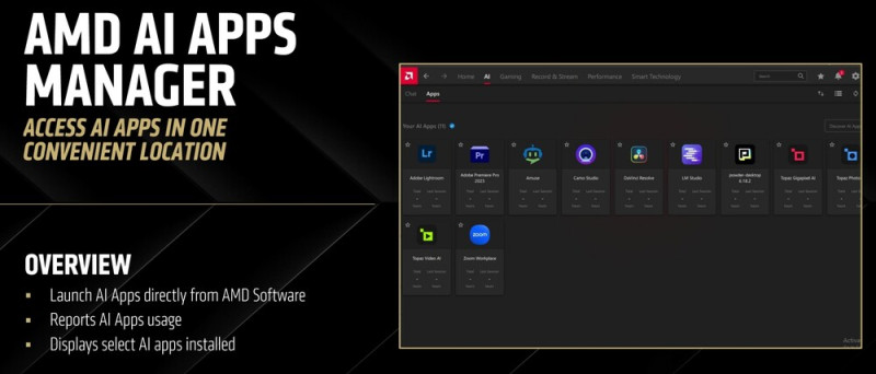 Az AMD a fentiek mellett az AI alkalmazásokat is közvetlenül indíthatóvá teszi az AMD Software vezérlőpultból, ezekhez pedig a felhasználó rendelhet specifikus profilbeállításokat is. Ennek jelenleg akkora jelentősége nincs, de később érkezhetnek olyan funkciók, amelyek által a most beépített képesség hasznos lehet.