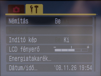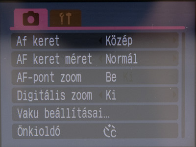 Az első fül alatt az autófókusz, a digitális zoom, a vaku beállításai, az időzítő, s hasonlók bújtak meg. A második alá a kevésbé érdekes dolgok, mint a kezdőkép (gép bekapcsolásakor mi jelenjen meg a kijelzőn), a hangerő, az energiatakarékosság, dátum, idő, stb. került.