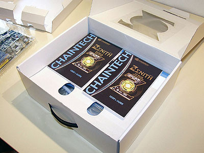 A Chaintech - szokásához, no meg a legrangosabb, Zenith szériához híven - óriási dobozban adja alaplapját. Döbbenetes, mennyi minden belefér az öblös csomagolásba. Aki nem látott még élőben Chaintech alaplap-dobozt, az pótolja e mulasztást, mert érdemes! Az alábbi képekről csak sejteni lehet a lényeget: