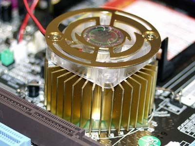 A CPU foglalat alatt található az északi híd. Kíváncsi természetünknek ezúttal kénytelenek voltunk engedni, s leszereltük az északi híd hűtőjét, hogy végre szemrevételezhessük azt a kis zöld négyzetet, ami ott vadul végzi a dolgát: