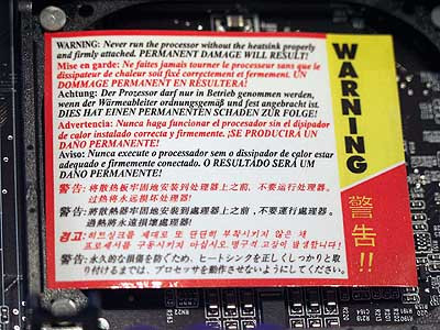 Miután sikerült a minket ért sokkból némileg visszatérni, elkezdtük a lap vizsgálatát. Első lépésben - mint mindig - most is az alaplap felépítését néztük, "ergonómiai" és "anatómiai" szemszögből. Figyelmünket elterelte a 478-as foglalatra ragasztott figyelmeztető matrica, ám ennek pont ez a funkciója: