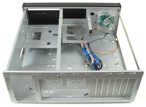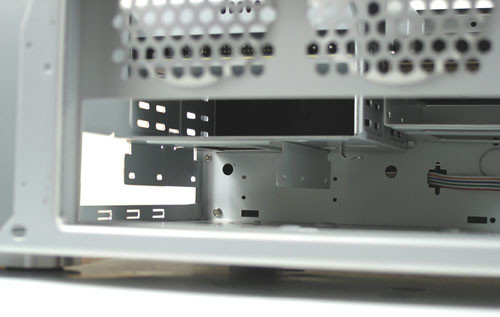 A belsőre pillantva mondhatni szokásos HTPC kiépítést láttunk. Balra elöl a két 5,25-ös meghajtóhely látható, melyek közül – ezzel az előlappal – csak a felső használható. A Bravo sorozatban BE-01 néven kapható ugyanez a belső szerényebb, irodába szánt, műanyag előlappal, azon mind a két hely hozzáférhető. A két nagy meghajtó mellé három kicsit szerelhetünk, melyek ismét vakok. Talán egy kártyaolvasó jól jött volna. A merevlemezek mellett van a ventilátor, melynek levegőjéből sajnos az adattáraknak nem sok jut.