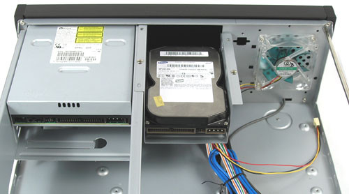 A Chieftec tervezői úgy gondolták, hogy aki egyszer összerakja – vagy inkább összerakatja – a HTPC-jét, az nem fogja túl gyakran szétszedni. A fekete fémborítás mindhárom oldala egyött jön le, egy masszív, U alakú lemez formájában. Hagyományos csavarok tartják a helyén, így segédeszközre lesz szükségünk eltávolításához. Az optikai meghajtó beszereléséhez további két csavart kellett kitekerni az előlap két oldalán. A lenyíló homlokzat mögött egy 8 centiméteres ventilátorhelyet is találtunk.