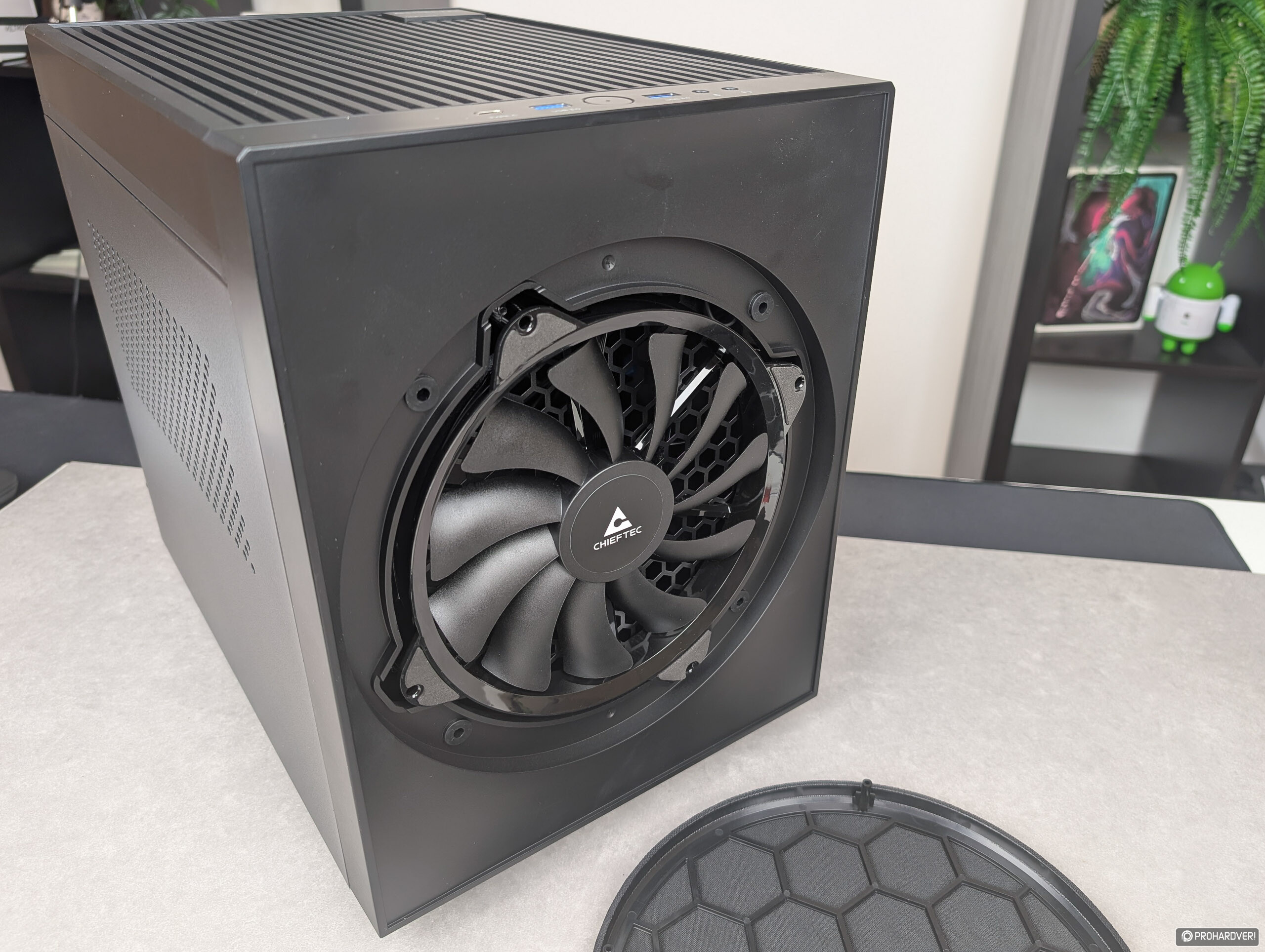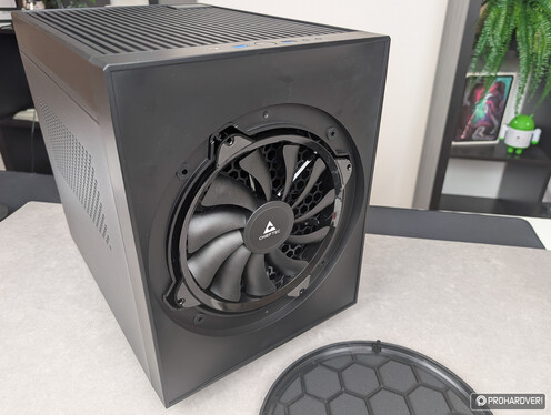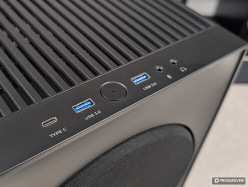Előlapjának, sőt, az egész dizájnnak a leginkább szembetűnő eleme a 200 mm-es ventilátort takaró védőszövet, mely pontosan úgy néz ki, és úgy is lehet eltávolítani, mint egy mélysugárzónál. Figyelembe véve, hogy ez a szövet szinte a teljes előlapot elfoglalja, a kezelőszervek és az I/O részleg tetőre került – itt egy darab bekapcsológombot, egy USB 3.2 Gen 2 Type-C interfészt, két USB 3.2 Gen 1 (korábbi nevén USB 3.0) Type-A portot, valamint a hanghoz tartozó két darab 3,5 mm-es jacket találjuk.