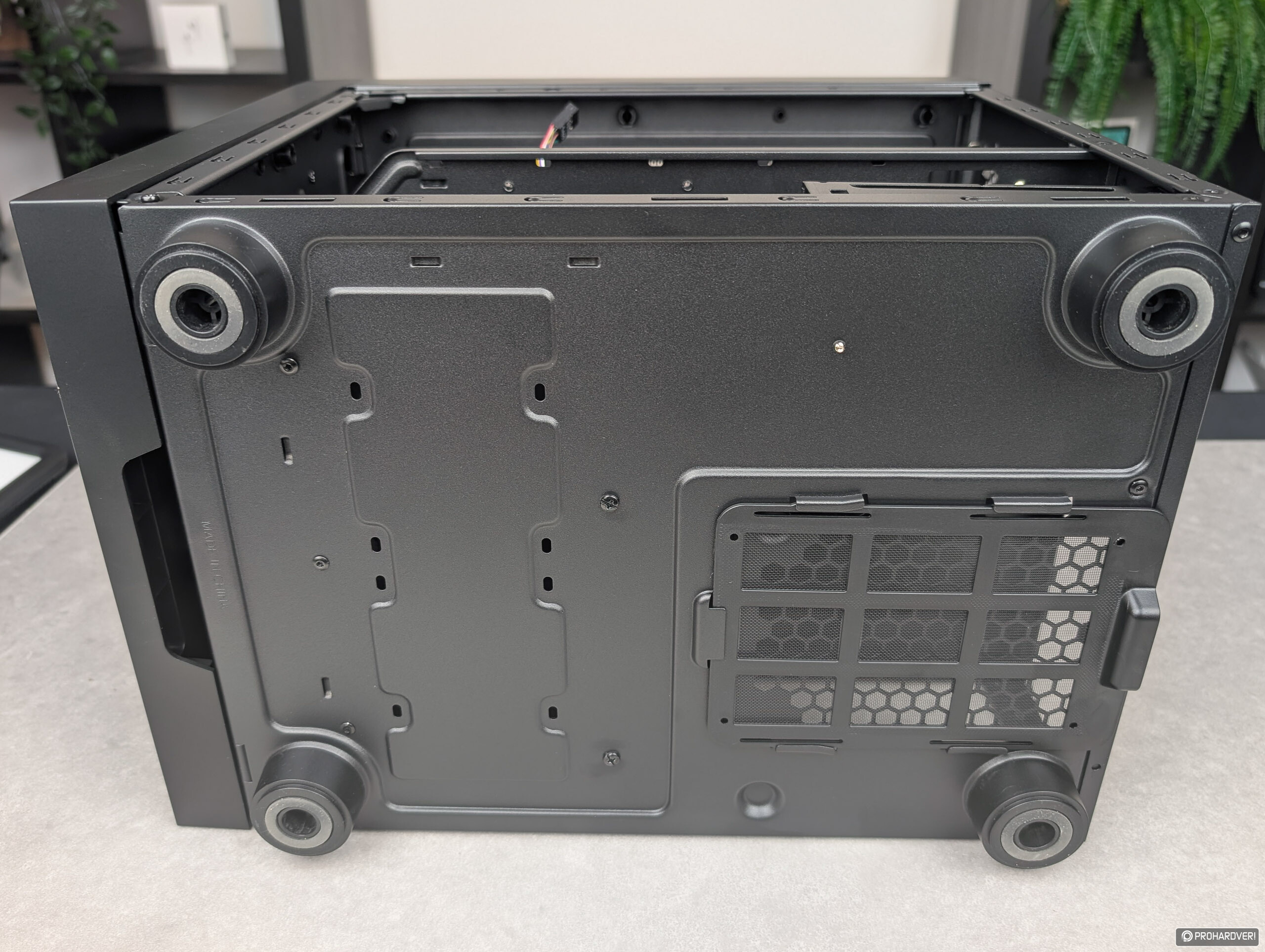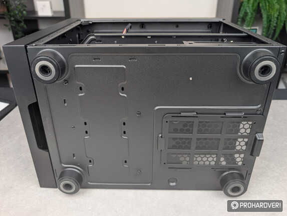 Végül ne feledkezzünk meg az alsó részről sem: a The Cube négy darab tömzsi lábon áll, a tápegység ventilátorához vezető nyílást pedig egy hátrafelé kihúzható porszűrő védi. Az előrébb lévő traktus tömör, itt nincs szellőzés, csak a HDD keretet tartó csavar feje látszik.