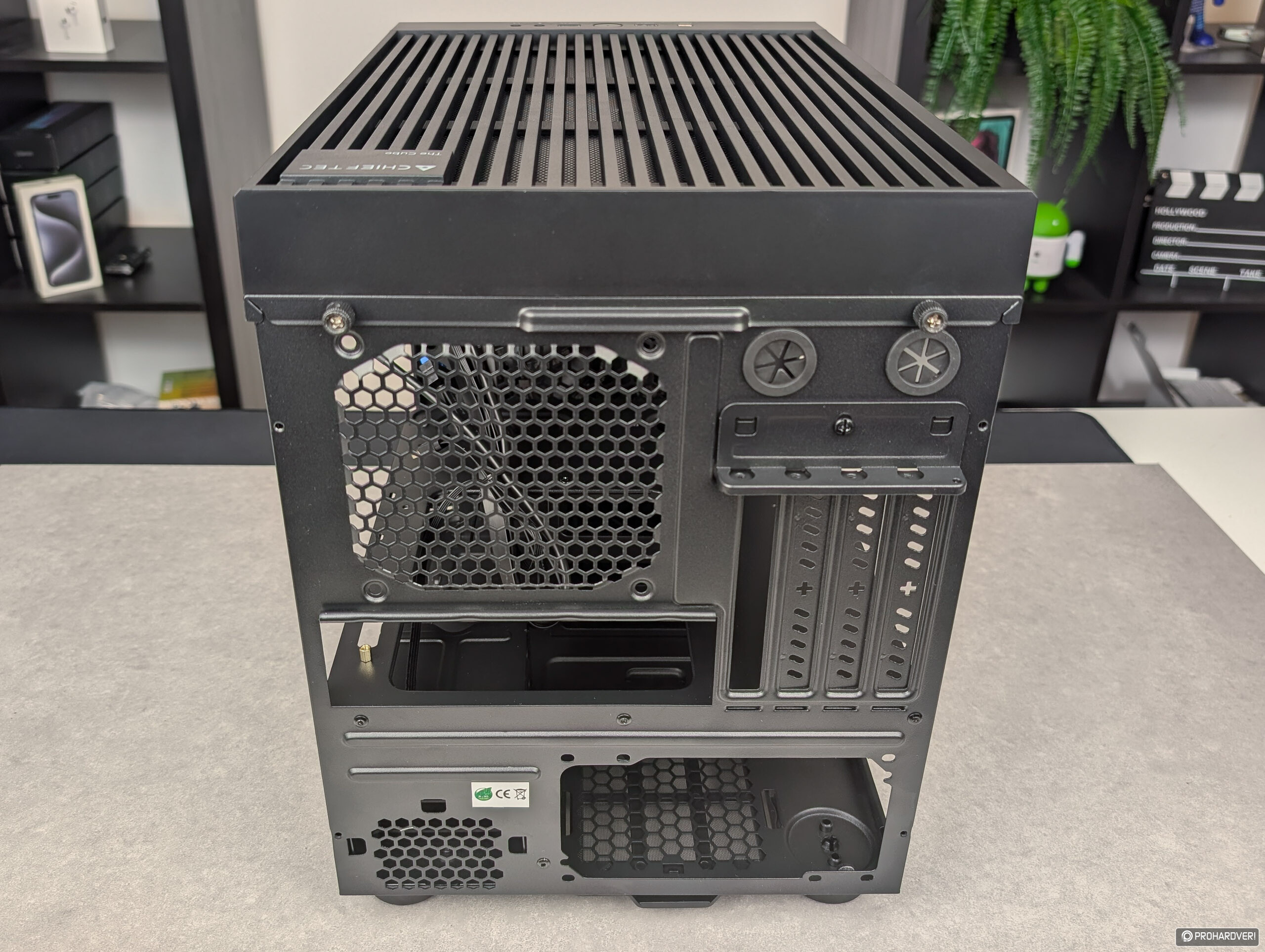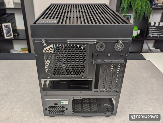 Áttérve a gépház hátoldalára, az első, ami szemet szúrhat, a két gumivédővel is ellátott csőkivezetés – bár a The Cube alapvetően nem az épített vízhűtésben gondolkodók számára készült, de a Chieftec láthatóan az ő igényeikről sem feledkezett meg. Kár, hogy ez az odafigyelés nem terjedt ki a bővítőkártyák nyílásaira, ezeket ugyanis nem csavarral rögzített, hanem kitörhető lemezek takarják – ez az, ami szerintünk tényleg csak a legalsó kategóriában lenne megengedhető. A négy darab nyílás mellett látható az alaplapi I/O részt fogadó nyílás, felette a 12 cm-es ventilátornak kialakított hellyel.