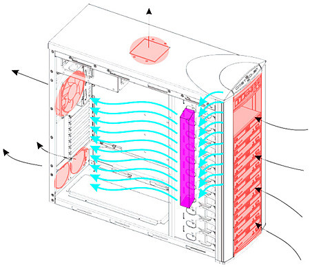 Igen, a szellőztető rendszert egészében tekintve akár levegőért is kapkodhatna a konkurencia, hiszen ehhez hasonló, vagy ezt megközelítő hatékonyságú megoldással egyelőre nem találkoztunk. A Coolermaster ábrája a légáramlásról: