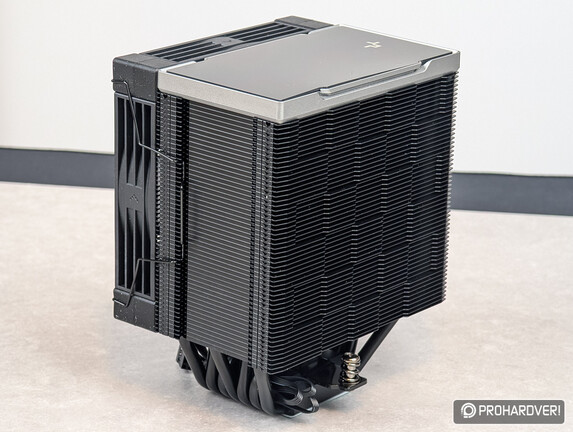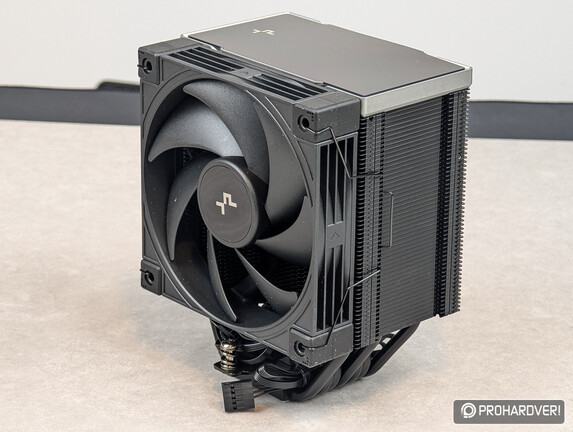 A DeepCool az elmúlt évek során egy egész egyedinek mondható formatervet dolgozott ki, és ez – bár ugye ízlésekről nem vitatkozunk – szerintünk ma az egyik legjobb már a piacon. Az AK700 egy tökéletes példája ennek: profi, mégis visszafogott, nincsenek rajta feleslegesen tolakodó díszítőelemek, de mégsem csak egy szimpla bordázat, hővezető csövekkel. Az egész külső legfeltűnőbb eleme a tornyot felülről lezáró idom, mely normál esetben egy digitális kijelzőként funkcionál, de ha kikapcsoljuk, akkor egy teljesen fekete, elegáns dizájnelem.