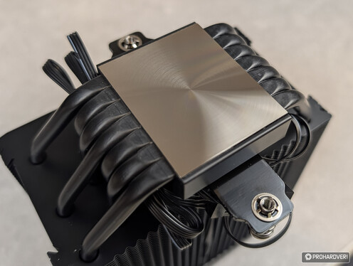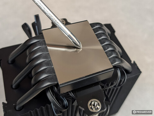 Alulról felfelé haladva, az AK700 alján egy nikkelezett talpat találunk, igényes megmunkálással, mely 7 darab, 6 mm-es hővezető csövet fog össze. Ezek lapítottak, de nem érintkeznek közvetlenül a CPU-val, szóval a lehető legjobb hőátadást kapjuk. A hővezető csövek gyakorlatilag a teljes talpat kitöltik, nehéz lenne még egynek helyet találni, az általuk tartott bordázat pedig offset elrendezésű, hogy a ventilátor ne akadjon össze túlzottan a magasabb memóriamodulokkal.