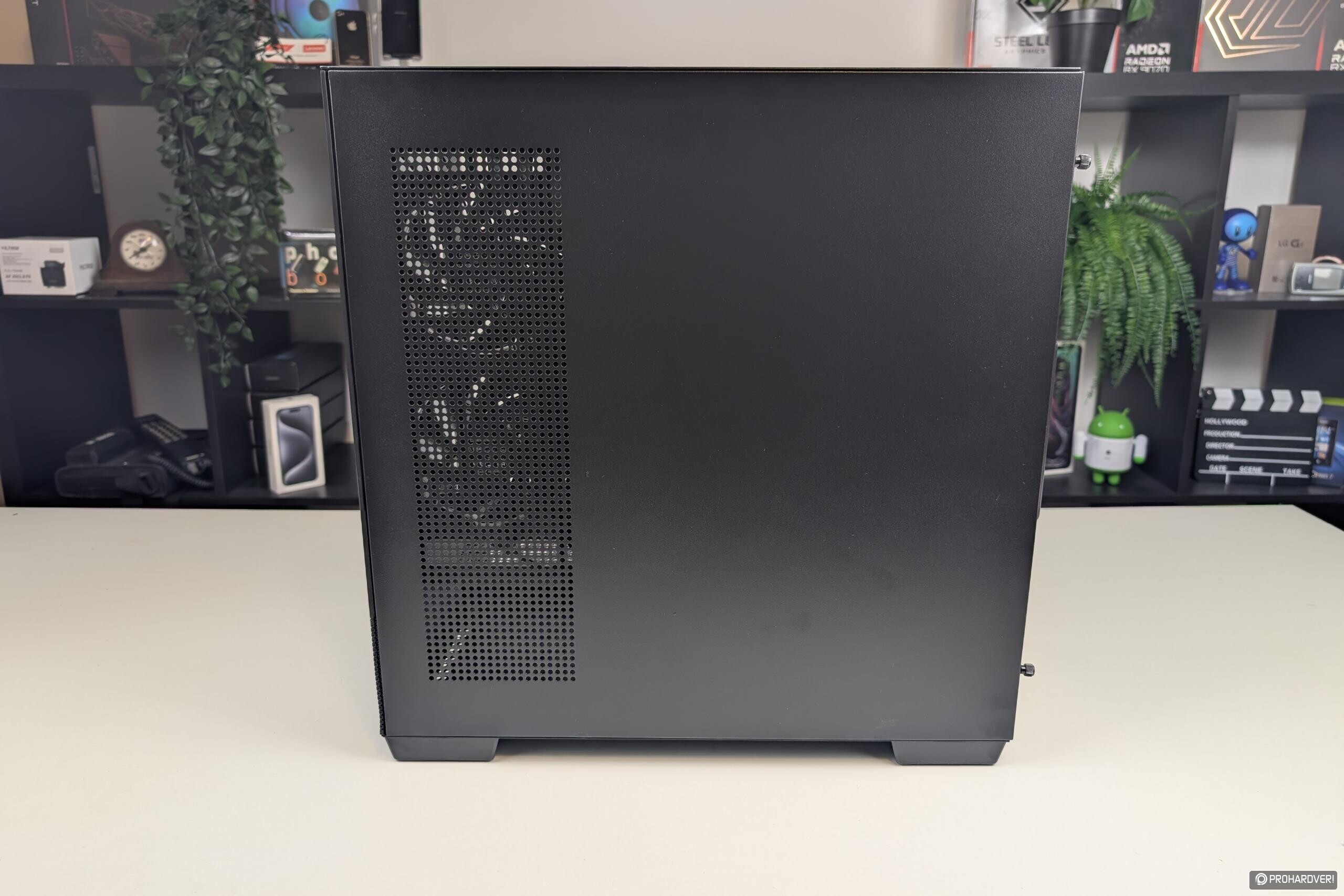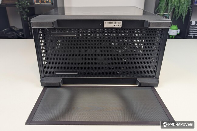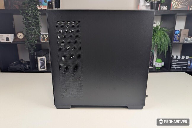 A jobb oldal fémlemez, ennek rögzítését kézzel oldható csavarok végzik, így gépházunk tulajdonképpen szerszámok nélkül nyitható. Alul és felül egyaránt a teljes oldalt beborító, mágneses rögzítésű rácsozat gondoskodik a szellőzésről, és kapott szellőzőt a jobb oldali lemez elülső része is, hiszen itt található a gyárilag beépített három darab ventilátorból kettő.