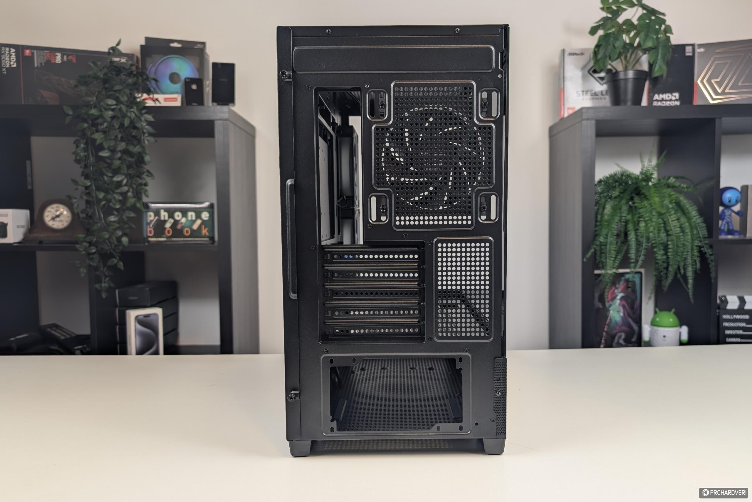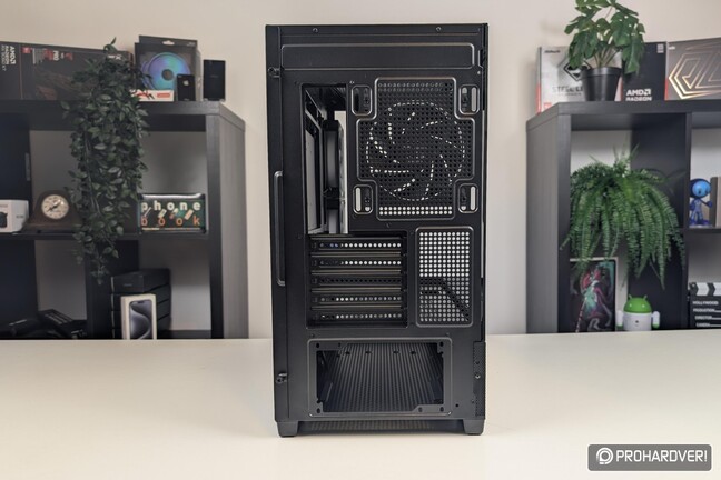 Gépházunk hátoldala átlagosnak mondható, viszont örömhír, hogy a bővítőkártyák helyeit takaró lemezek nem kitörős, hanem csavaros megoldásúak.