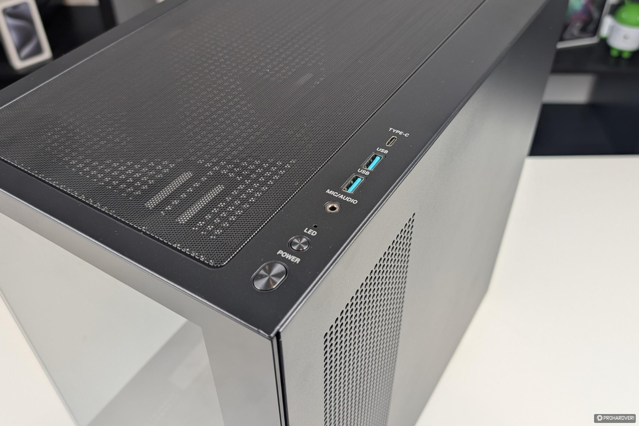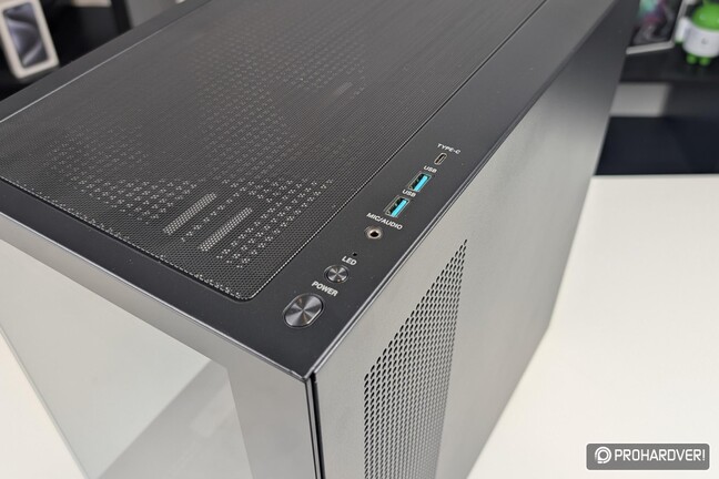 Tesztalanyunkról nem hiányoznak a csatlakozók sem, melyek a modern igényekre szabottak: egy 10 Gbps-es Type-C és két 5 Gbps-es Type-A port várja a külső perifériákat, illetve két 3,5 mm-es jack csatlakozó a headsetet. Extra gombot kapott az ARGB vezérlő: ha nem akarjuk az alaplapra bízni a világítás szinkronizálását, akkor ezt nyomogatva lépegethetünk a színek és effektek között.