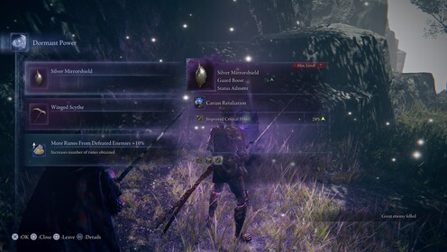 A játéktér dinamikus szűkülése erőteljesen idézi a battle royale játékok mechanikáját: a térképen kijelölt biztonságos zóna egy kör alakú határ mentén fokozatosan zsugorodik, és aki ezen kívülre kerül, az folyamatosan sebződik, míg csak vissza nem tér a kijelölt területre – az éjféli bossfightok pedig természetesen mindig középen lesznek. A nappali harcok sikeres teljesítése rúnákkal jutalmaz, amelyek a megszokott módon szintlépésre és tárgyvásárlásra fordíthatók. A szintlépés rendszere azonban nem a megszokott: a Nightreignben nem szükséges (értsd: nem lehet) kézzel szétosztani a pontokat az egyes attribútumokra, a fejlődés automatikusan, a választott karakterünknek megfelelően igazodva történik. Új felszereléshez számos forrásból juthatunk: zsákmányként a legyőzött ellenfelektől, drága pénzért a kereskedőktől, illetve talált kincsként a pályán elszórt ládákból. Bár páncélt nem cserélhetünk, a fegyverek pedig csak az adott nekifutás végéig vannak nálunk (igen, minden nekifutást Nightfarerünk alapfegyverével kezdünk), egyéb egyszerhasználatos és permanens tárgyak csőstül várnak ránk. A legtöbb eszközből több ritkasági szint létezik, és a legendás besorolású cuccokat általában a főellenfelektől szerezhetjük meg – de a térképen is jelölt erődökben, kastélyokban és katakombákban is szinte minden esetben rejlik valami tápos zsákmány.