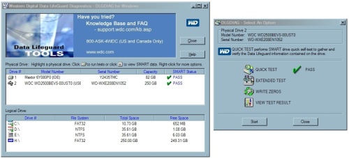 A DLGDIAG-gal, azaz teljes nevén Data LifeGuard Diagnostics-szal a háttértár állapotát mérhetjük fel. A program a kisebb vagy nagyobb tesztet futtatva végigpásztázza a lemezeket hibák után kutatva. Lényegében a WD saját Scandiskje.