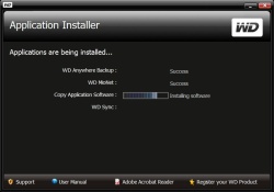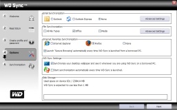 A WD Sync-kel fájlainkat szinkronizálhatjuk. Részletesen testreszabható, hogy milyen fájltípusokat, könyvtárakat keressen és egyeztessen. Levelezésünket, internetböngészőnk kedvenceit is szinkronizálhatjuk a merevlemezen található változatokkal. A winchesterre kerülő adatokat titkosíthatjuk is természetesen, 128 bites kulccsal.